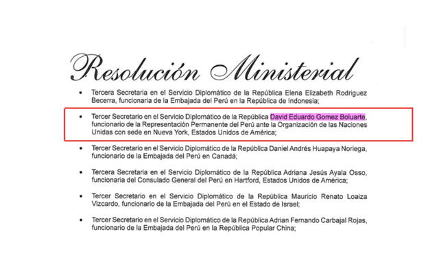 David Eduardo Gómez Boluarte, quien es diplomático de profesión, fue designado como tercer secretario de la representación permanente del Perú ante la ONU.