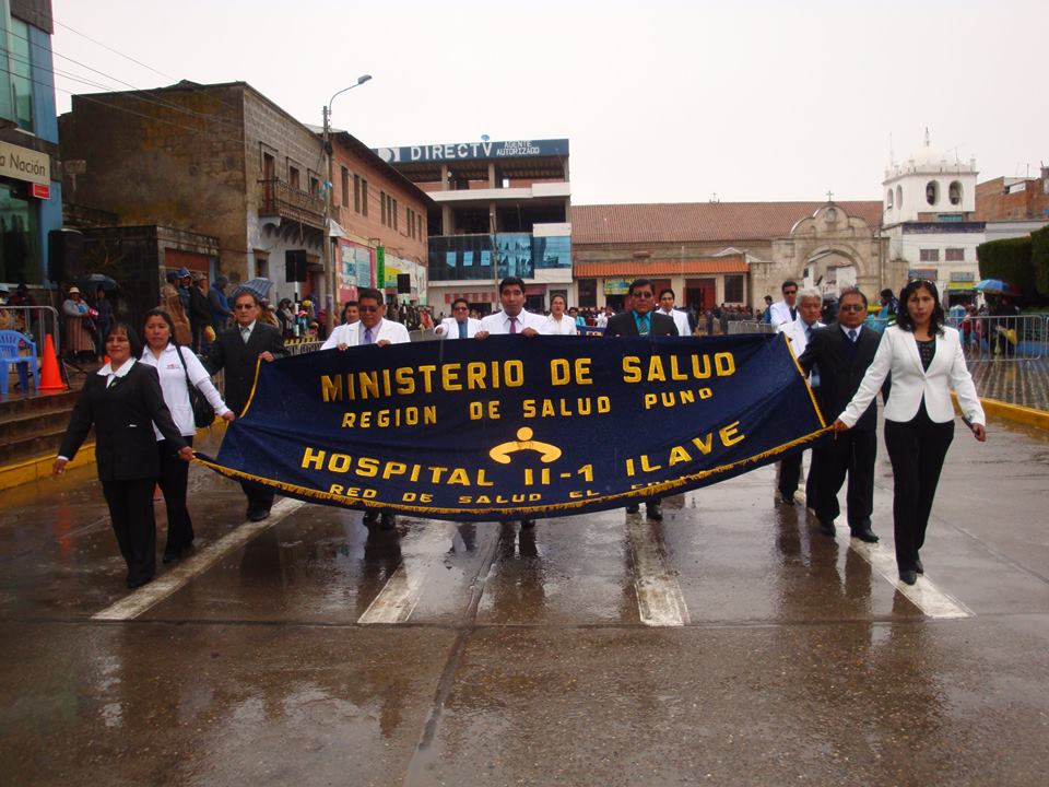 En plena llovizna personal profesional y técnicos asistenciales del Hospital II-1 de Ilave participaron en el desfile cívico por su Aniversario de Creación, gracias a las delegaciones por sumarse a este desfile y acompañar en esta ceremonia cívica por un merecido homenaje al Hospital II-1 Ilave, que se conmemora cada 22 de octubre. (Red de Salud El Collao, Micro Red, Mazocruz, Checa, Pilcuyo, Camicachi e Ilave-Metropolitano)