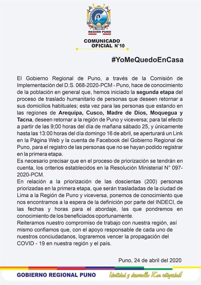 Gobierno Regional de Puno desde el dia de hoy habilita un link para que se inscriban puneños que se encuentra en regiones vecinas , estará disponible desde las 9 de la mañana y cerrará el día mañana domingo a las 13 horas.