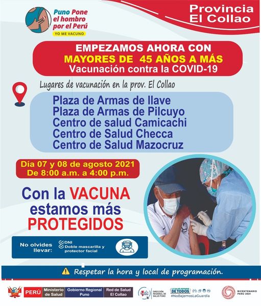 Este sábado y domingo se cumplirá en la provincia El Collao, vacunación contra la covid-19 a adultos mayores de 45 años, en Ilave como único punto es la plaza de armas, en el distrito de Mazocruz es en la plaza, Checca, centro de salud y Camicachi, en el distrito de Pilcuyo se instala en la plaza de armas la vacunación. Se prevé vacunar a más 2 mil personas de esta parte de la región Puno.