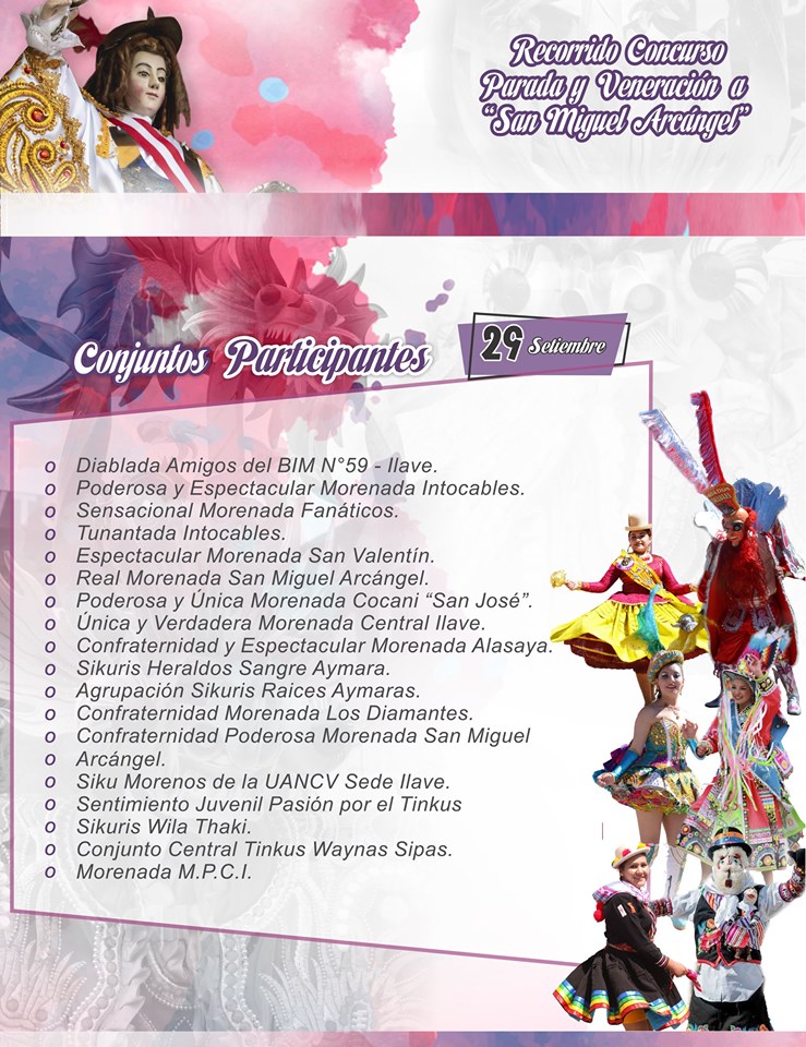 A pocos días de la presentación oficial de la Festividad San Miguel Arcángel de Ilave, 18 conjuntos ya confirmaron su participación en esta actividad religiosa cultural, el cual contará con miles de danzarines que demostrarán su devoción al ritmo de numerosas bandas de músicos provenientes de Ilave, Puno, Tacna y Bolivia.