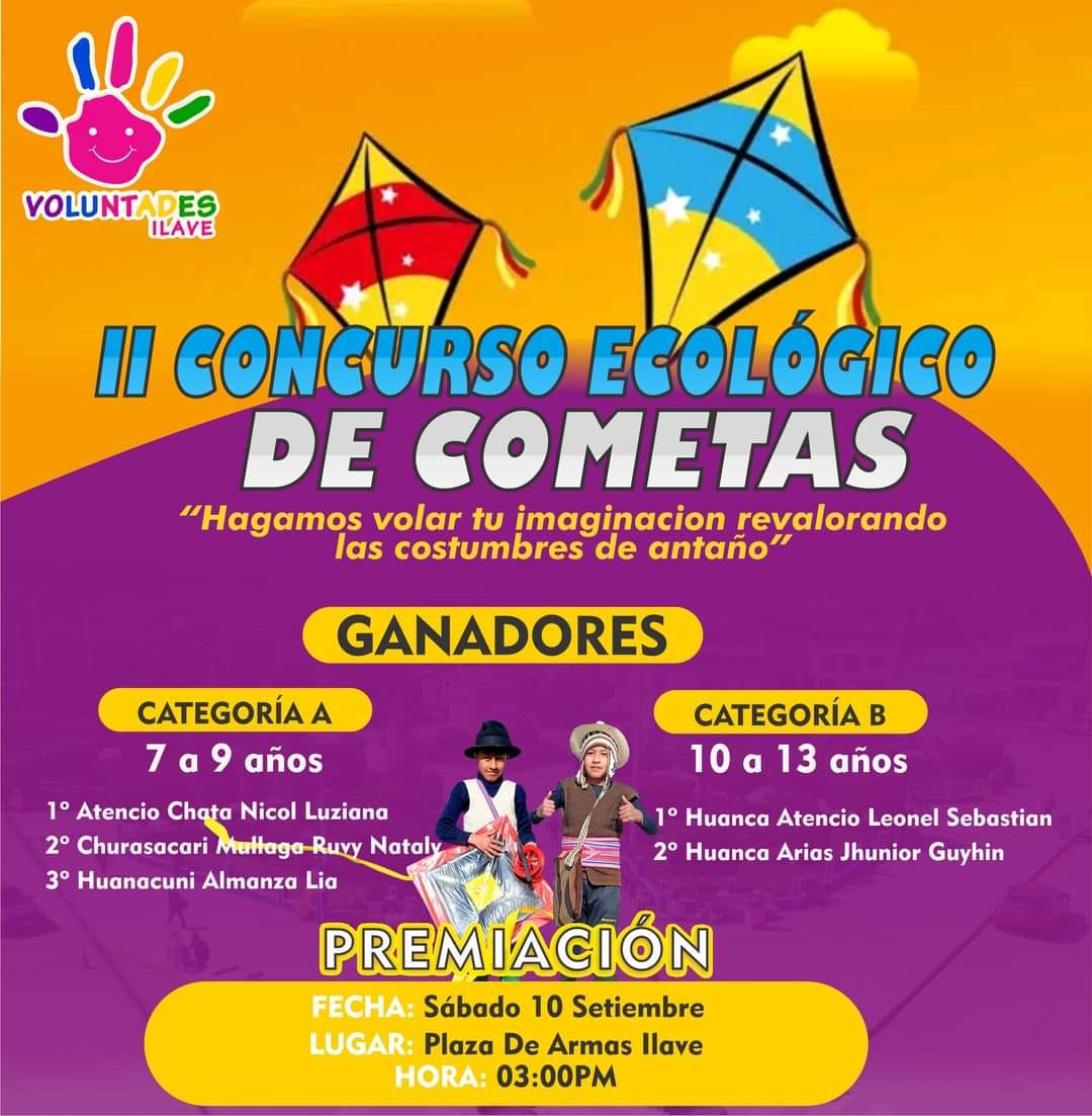 Este último sábado 3 de setiembre se llevó a cabo el II concurso ecológico de cometas en la ciudad de Ilave, el mismo que se cumplió en el parque El Mirador, organizado por la organización de jóvenes VOLUNTADES Ilave.