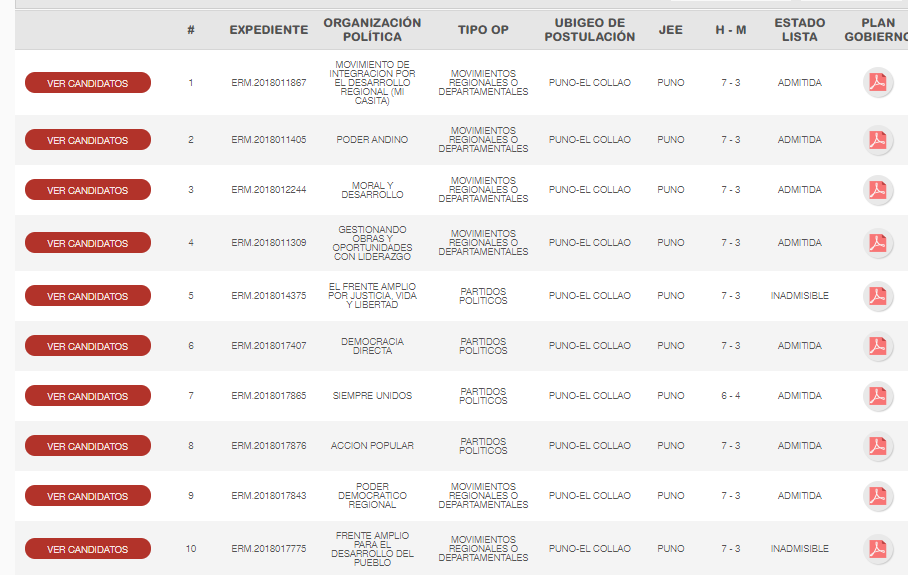 Los candidatos admitidos por el Jurado Electoral Especial de Puno son :