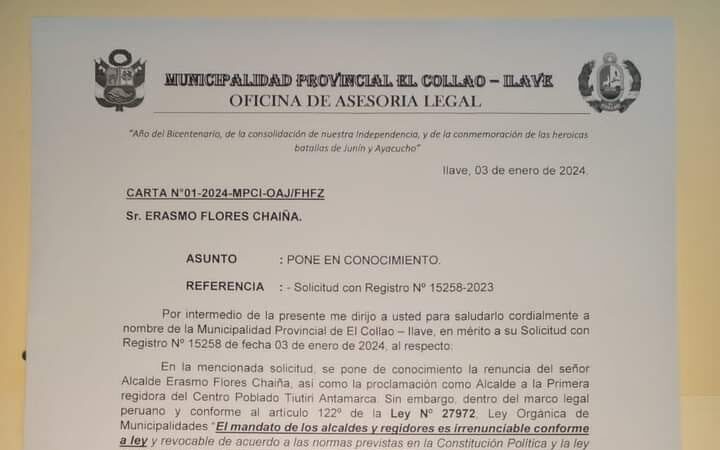 El asesor legal de la municipalidad provincial El Collao, el abog. Fredy Flores Zirena mediante una carta pone en conocimiento, en merito a la solicitud presentada el 3 de enero lo siguiente; Según el marco legal establecido en el artículo Nº 122 de la ley Nº 27972 de la ley orgánica de municipalidades, el cargo de alcalde es irrenunciable. Esto significa que la renuncia del alcalde no puede ser aceptada y tampoco se puede proclamar a un nuevo alcalde en su lugar.