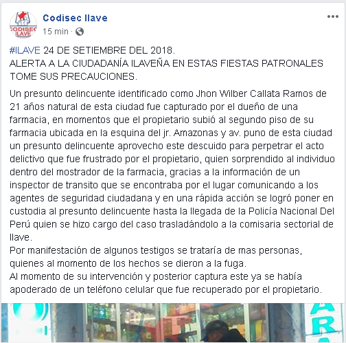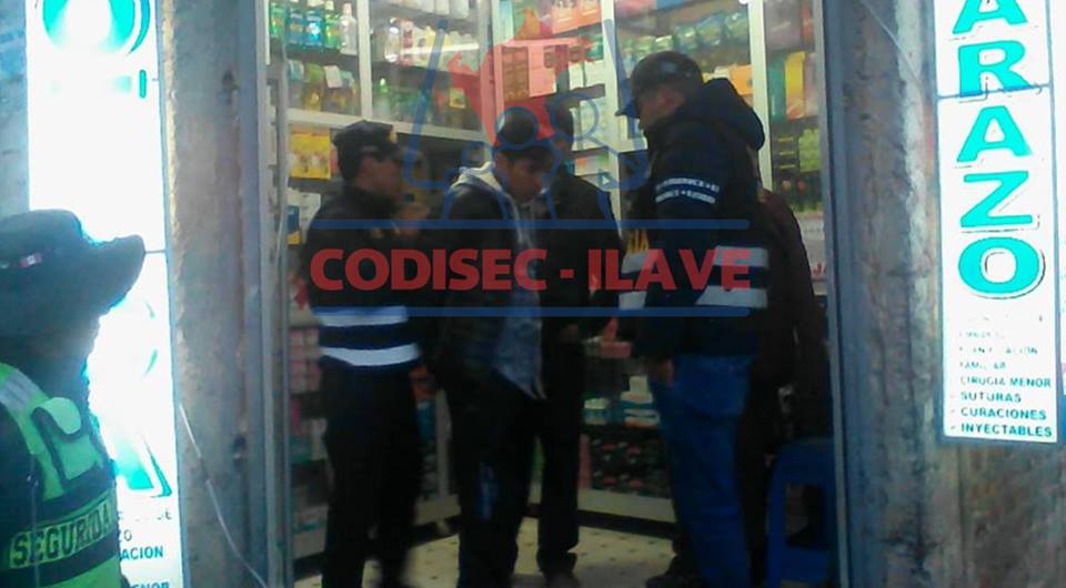 Un presunto delincuente identificado como Jhon Wilber Callata Ramos de 21 años natural de esta ciudad fue capturado por el dueño de una farmacia, en momentos que el propietario subió al segundo piso de su farmacia ubicada en la esquina del jr. Amazonas y av. puno de esta ciudad un presunto delincuente aprovecho este descuido para perpetrar el acto delictivo que fue frustrado por el propietario, quien sorprendido al individuo dentro del mostrador de la farmacia, gracias a la información de un inspector de transito que se encontraba por el lugar comunicando a los agentes de seguridad ciudadana y en una rápida acción se logró poner en custodia al presunto delincuente hasta la llegada de la Policía Nacional Del Perú quien se hizo cargo del caso trasladándolo a la comisaria sectorial de Ilave.