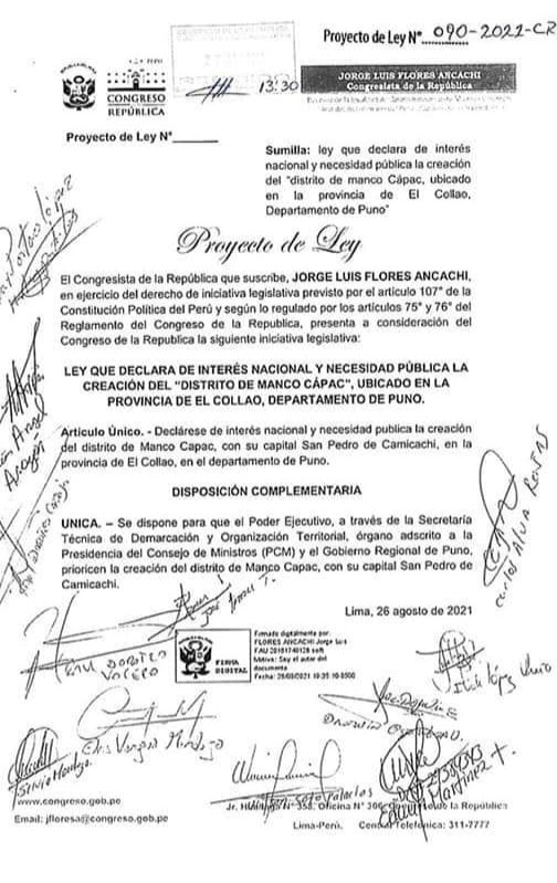 El proyecto de Ley es presentado por parlamentario Jorge Luis Flores Ancachi, dijo que se ha dado un paso importante para la futura creación del distrito de Manco Capac (Camicachi), con la finalidad de cumplir con un largo anhelo de los pobladores de los centros poblados y parcialidades que componen este distrito de la zona lago de Ilave.