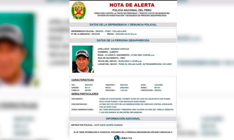 Cualquier información sobre su paradero, comunicarse con la Base Central de Seguridad Ciudadana de Ilave al número 963176116 o a la línea de emergencia 114.