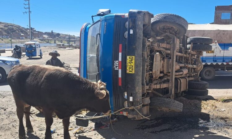 En Ilave, ayer domingo se registró un accidente de tránsito, a pocos metros del puente internacional de Ilave. Un camión cargado de ganado vacuno se despistó a un costado de la vía.