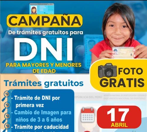 Para este 17 de abril se anuncia una campaña gratuita de tramite DNI en la ciudad de Ilave, para mayores y menores de edad, la actividad se realizará desde las 8 y 30 de la mañana hasta las 2 de la tarde.