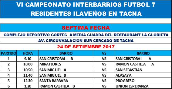 Este domingo 24 de setiembre se jugara la setima fecha del VI campeonato de inter barrios de fútbol 7 de residentes ilaveños en Tacna , en dicho campeonato participan 12 equipos , los partidos empezaran a jugar desde las 9 am en el Complejo deportivo CORTEC de la ciudad heroica .