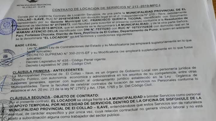 Ilave : CONTRATO DE SERVICIOS REVELA QUE REGIDOR DE LA MUNICIPALIDAD DE EL COLLAO ILAVE HABRÍA COMETIDO NEPOTISMO