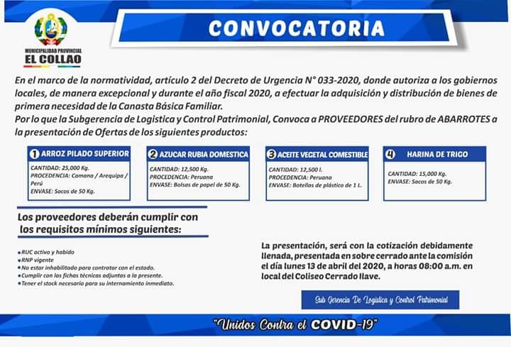Ante el desistimiento de los proveedores seleccionados por la comisión de compra y distribución de la canasta básica familiar que conforman los dirigentes, autoridades y funcionarios de la Municipalidad Provincial de El Collao-Ilave y en el marco de la normatividad, artículo 2 del Decreto de Urgencia N° 033-2020, donde autoriza a los gobiernos locales, de manera excepcional y durante el año fiscal 2020, a efectuar la adquisición y distribución de bienes de primera necesidad de la Canasta Básica Familiar.