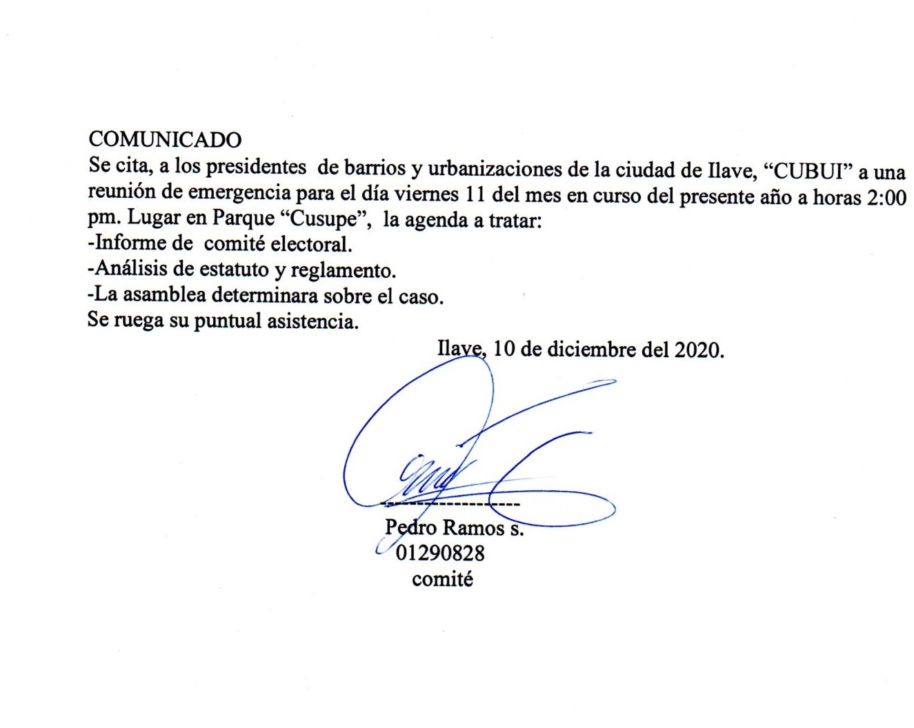 El presidente del comité de electoral de la Centra Única de Barrios y Urbanizaciones de Ilave (CUBUI) convoca a una reunión a presidentes de barrios y urbanizaciones de la ciudad de Ilave, que se llevará este viernes 11 de diciembre del 2020 en el parque Cusupi.