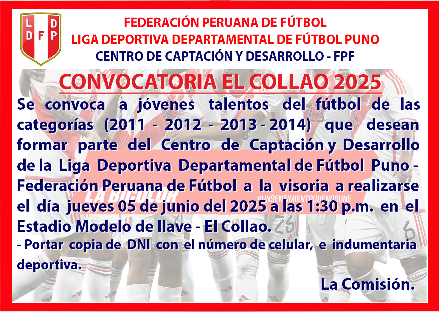 La Federación Peruana de Fútbol (FPF), a través de la Liga Deportiva Departamental de Fútbol Puno, anunció una convocatoria oficial dirigida a jóvenes talentos de las categorías 2011, 2012, 2013 y 2014, como parte del programa del Centro de Captación y Desarrollo.