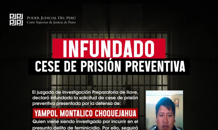 El magistrado Ciro Oviedo Mamani Flores, juez del Juzgado de Investigación Preparatoria de Ilave, declaró infundado el pedido de cesamiento de prisión preventiva presentado por la defensa de Yampol Montalico Choquejahua (30), quien viene siendo investigado por incurrir en el presunto delito de feminicidio.