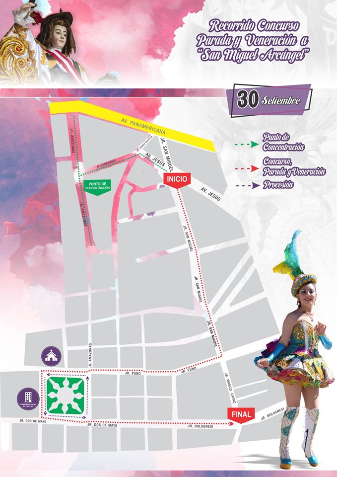 La ruta del concurso, parada y veneración en honor al Santo Patrono de Ilave, San Miguel Arcángel, fue modificada. Según informó la comisión organizadora de esta festividad, a partir de este año la ruta se ampliará teniendo como punto de concentración el cruce del Jr. Amazonas con el Jr. Lambayeque, el inicio se dará desde la intersección entre la Av. Jesús con el Jr. San Miguel, el recorrido continuará por Jr. Puno que empalma a la Plaza de Armas (parte central), luego continuará por Jr. 2 de Mayo, la culminación será en el Jr. Bolognesi cerca al Cementerio General de Ilave.