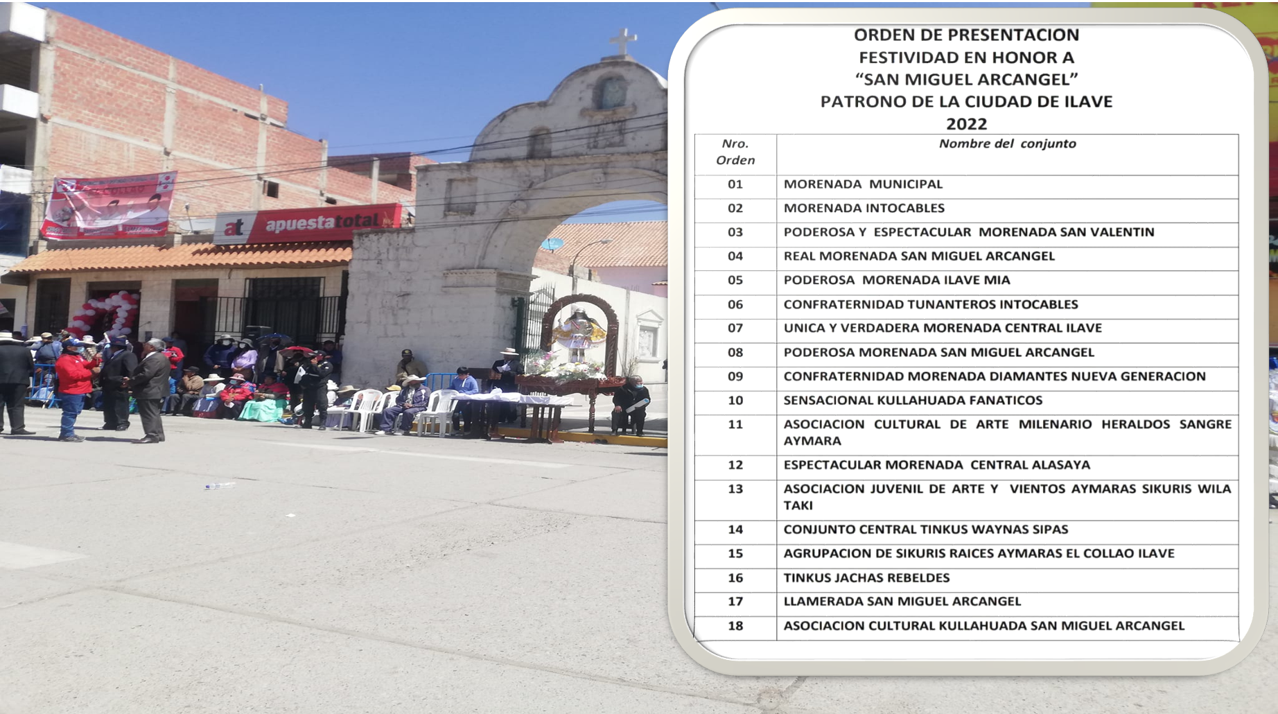 El presidente de la Asociación folclórica El Collao, Diego Coaquira Gomez sostuvo la veneración en honor a San Miguel Arcangel será en calidad de concurso, asimismo compartió las bases a Radio Excelente, donde la participación de los conjuntos folclóricos será en tres categorías; en la categoría “A” están las morenadas, Cat. “B” Kullawadas, llameradas, tinkus y tunantada, cat. “C” sicuris de varios bombos y de un solo bombo.