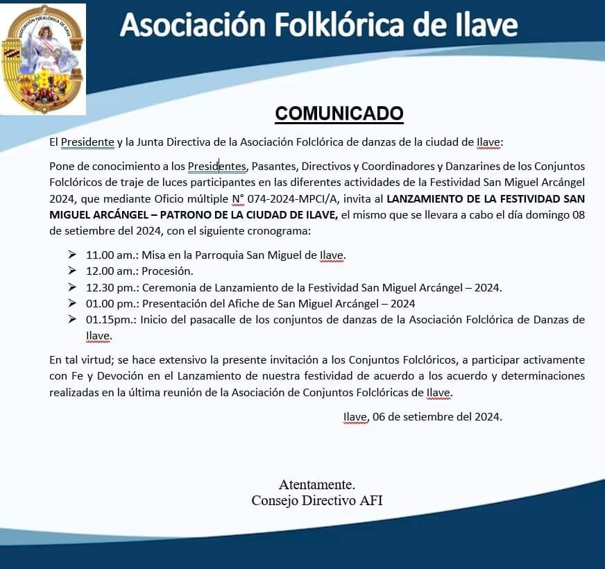 La Comisión Central de la Festividad San Miguel Arcángel 2024 de la Municipalidad El Collao en coordinación con la Asociación Folklórica de Ilave y Parroquia San Miguel han determinado el inicio de las celebraciones de la Festividad San Miguel Arcángel el domingo 8 de setiembre, con el Lanzamiento Oficial y presentación de afiche promocional de la festividad, se conoce que al menos 19 conjuntos folklóricos estarían participando en esta celebración que tiene como fecha central el 29 de setiembre.