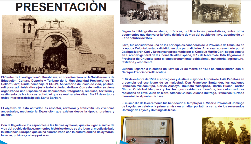 El Centro de Investigación Cultural-Ilave compuesto por el historiador Jaime Juan Atencio Anahua, profesor Edgar Cutipa Vilca, prof. Jaime Muñiz Arocutipa y Geronimo Ticona Alanoca. Realizaran la exhibición reliquias, antigüedades en textilería orfebrería, vestimenta, se exhibirá de manera organizada con las entidades involucradas para cumplir este evento.