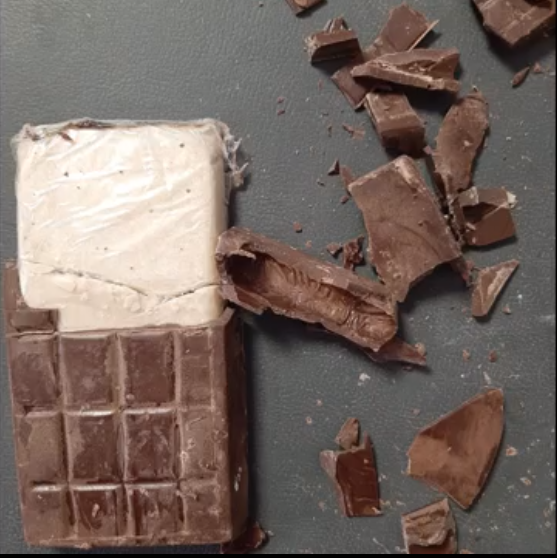 En su interior se encontró barras de chocolate forradas con papel platino unas con inscripción chocolate 100 % cacao. Ante la duda, se realizó una prueba de campo a unas tabletas, cuyo resultado dio positivo para alcaloide de cocaína.