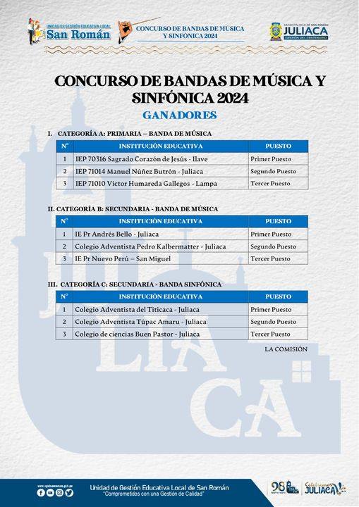 Ayer miércoles, se llevó a cabo el Concurso de bandas de Música y Sinfónica 2024 en Juliaca, donde participaron diferentes Instituciones Educativas de primaria y secundaria por el aniversario de la provincia de San Román – Juliaca. En donde la IEP 70316 Sagrado Corazón de Jesús obtuvo el primer lugar en la categoría A (primaria),