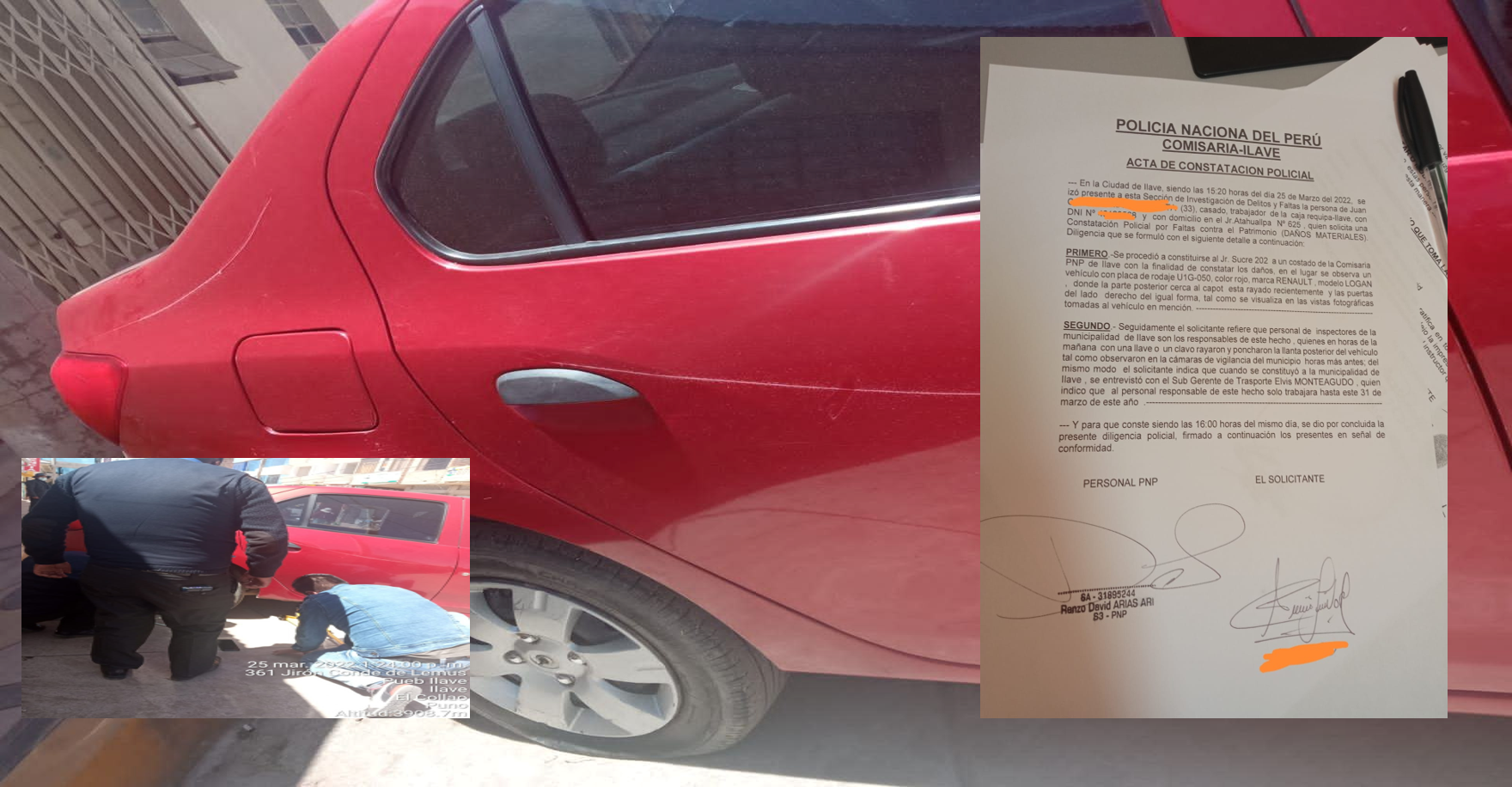 Asimismo, dijo yo me pregunto si ya ellos asumieron que causaron daños y se mostraron las pruebas. La Víctima, de los pinchadores tendría que pagar el 50%, luego vía comunicación telefónica el subgerente le manifiesta que ese 50% o lo tomas o lo dejas y que, si quería que denuncie, que igual no iba pasar nada, ante la actitud autoritaria la víctima del inspector pinchador de llantas procedió con la denuncia policial en la comisaría de Ilave.