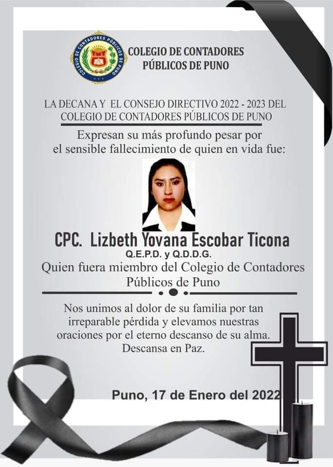 La víctima que sufrió el accidente de tránsito a la altura del grifo Huanca ubicado en la avenida Puno con Martires fue identificada como Lizbeth Yovana Escobar Ticona (25). La mujer venia junto a si esposo por la vía cuando de pronto fue embestida por el vehículo que iba a excesiva velocidad.
