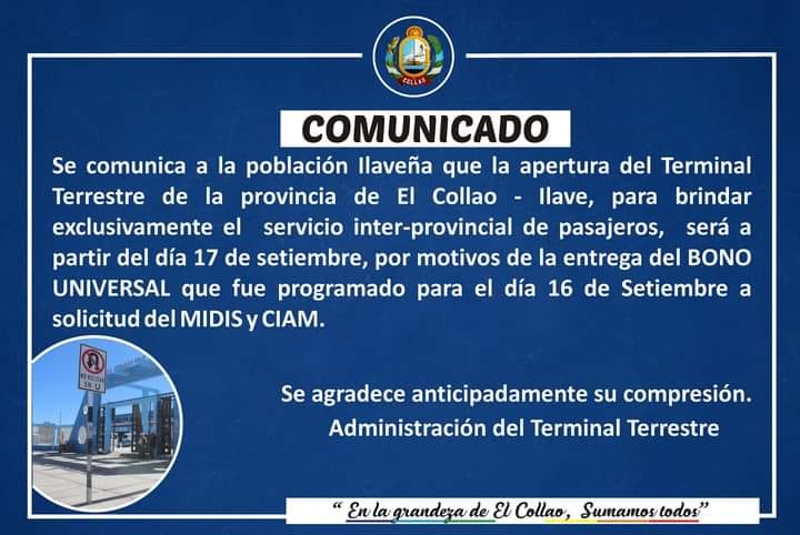 Se comunica a la población Ilaveña que la apertura del Terminal Terrestre de la provincia de El Collao – Ilave, para brindar exclusivamente el servicio inter-provincial de pasajeros, será a partir del día 17 de setiembre, por motivos de la entrega del BONO UNIVERSAL que fue programado para el día 16 de setiembre a solicitud del MIDIS y CIAM.