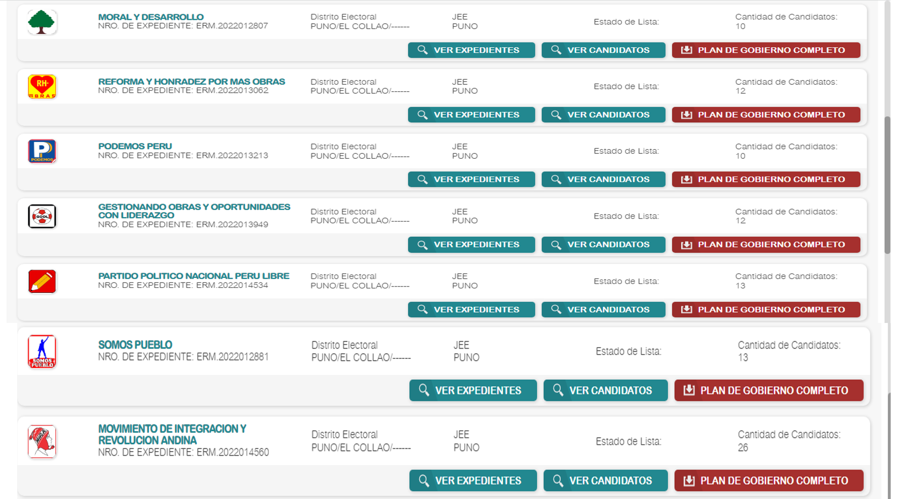 Ante el Jurado Electoral Especial Puno solo 7 listas de candidatos provinciales hasta el momento han solicitado su inscripción. Rene Huanacuni Gomez, Pablo Jesus Huaycani Chavez, Sergio Roque Maquera, Juan Zurita Chura, Elmer Rolando Calliri Chura, Fredy Edwin Copaja Maquera y Richard Ururi Cueva.