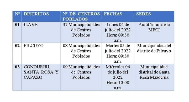El evento iniciará el próximo 04 de julio para el distrito de Ilave que comprende 37 municipalidades de centros poblados a horas 9:30 a.m. en el auditorio de la comuna collavina, así mismo el martes 05 de julio se capacitará a 08 municipalidades de centros poblados del distrito de Pilcuyo en la municipalidad de dicho distrito, seguidamente el miércoles 06 de julio se llevará a cabo la capacitación de 09 municipalidades de centros poblados de los distritos de Conduriri, Santa Rosa y Capaso en los ambientes de la municipalidad de Santa Rosa Mazocruz.