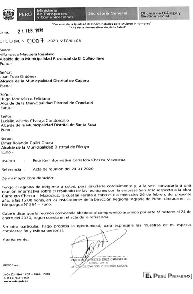 MTC programó una reunión informativa en Puno , cursó la invitación a las autoridades de la provincia y distritos,se esta cumpliendo el miércoles 26 de febrero en las instalaciones de la Dirección Regional Agraria ,ubicada en el jiron Moquegua N°264-Puno a las 3:00 pm.