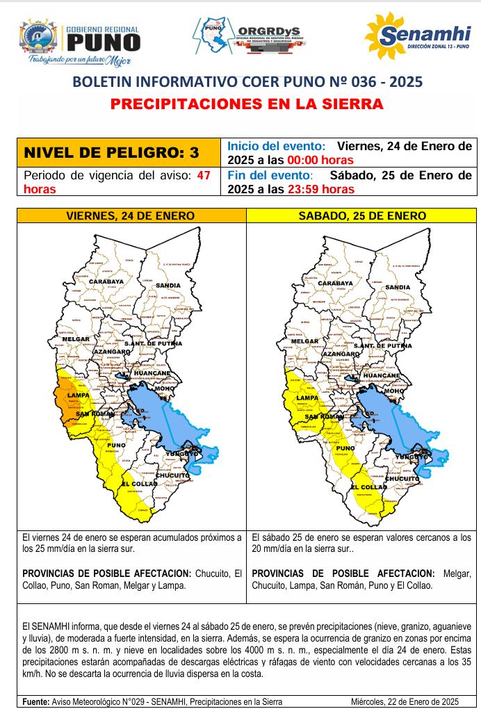 El Servicio Nacional de Meteorología e Hidrología del Perú (SENAMHI) emitió un aviso meteorológico, extendiéndose las lluvias hasta este sábado 25 de enero, anunciándose la ocurrencia de precipitaciones de moderada a fuerte intensidad en el departamento de Puno. Este fenómeno incluirá nieve, granizo, aguanieve y lluvia, y estará acompañado de descargas eléctricas y ráfagas de viento con velocidades cercanas a los 35 km/h.