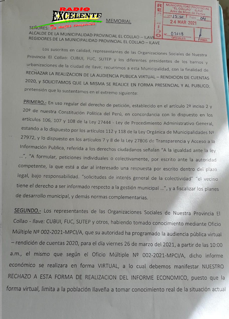 Las organizaciones populares de la ciudad de ILAVE, presentaron un memorial ayer miércoles 24 de marzo solicitando que la audiencia pública virtual programado para este viernes 26 de marzo, se lleve de forma presencial. En radio Excelente la presidenta de la Central Única de Barrios y Urbanizaciones (CUBUI) Veronica Quenaya Charca manifestó, que es un acuerdo de las organizaciones que estamos presentando como Frente único de Comerciantes (FUC), SUTEP y CUBUI, no es posible que sea restringido, se tiene que llevar en público, caso contrario no asistiremos.