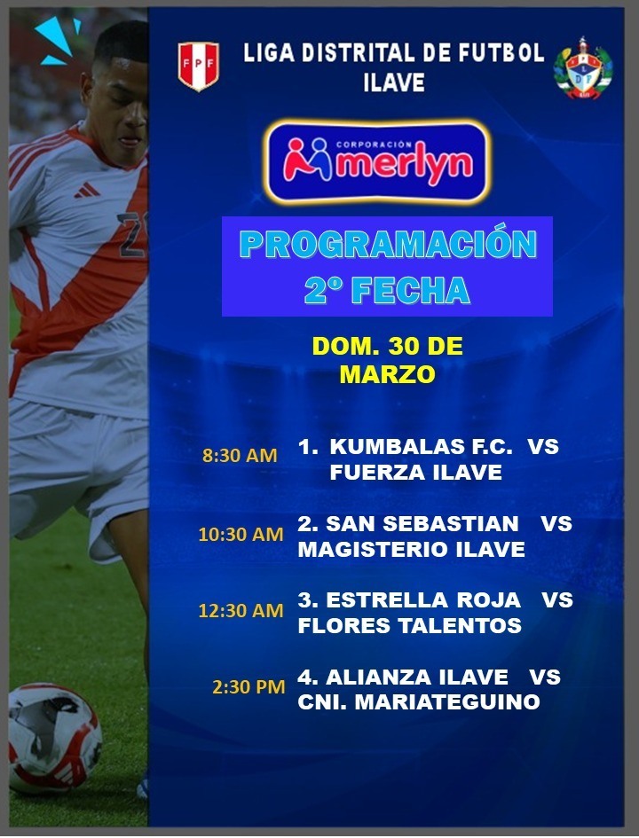 Este domingo 30 de marzo se disputará la segunda fecha de la Liga Distrital de Fútbol de Ilave con emocionantes encuentros. La jornada arrancará a las 8:30 a. m. con el partido entre Kumbalas F.C. y Fuerza Ilave.