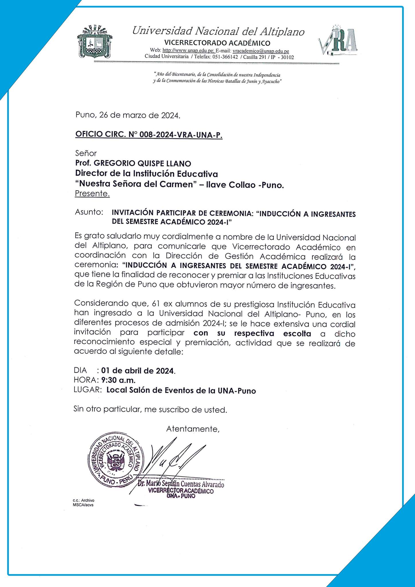 Un total de 61 exalumnos de la Institución Educativa Secundaria (IES) “Nuestra Señora del Carmen” de la provincia de El Collao serán reconocidos y premiados por haber logrado el ingreso a la Universidad Nacional del Altiplano Puno en los diferentes procesos de admisión 2024-I.