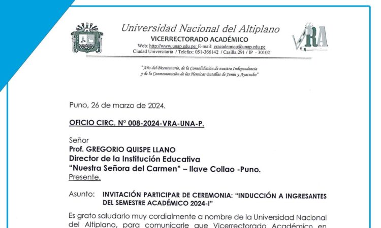 La invitación a estos ingresantes a la UNA Puno fue extendida por el Vicerrectorado Académico de la universidad, a cargo de Mario Cuenta Alvarado, en el marco de la ceremonia de “Inducción a Ingresantes del Semestre Académico 2024-I”.