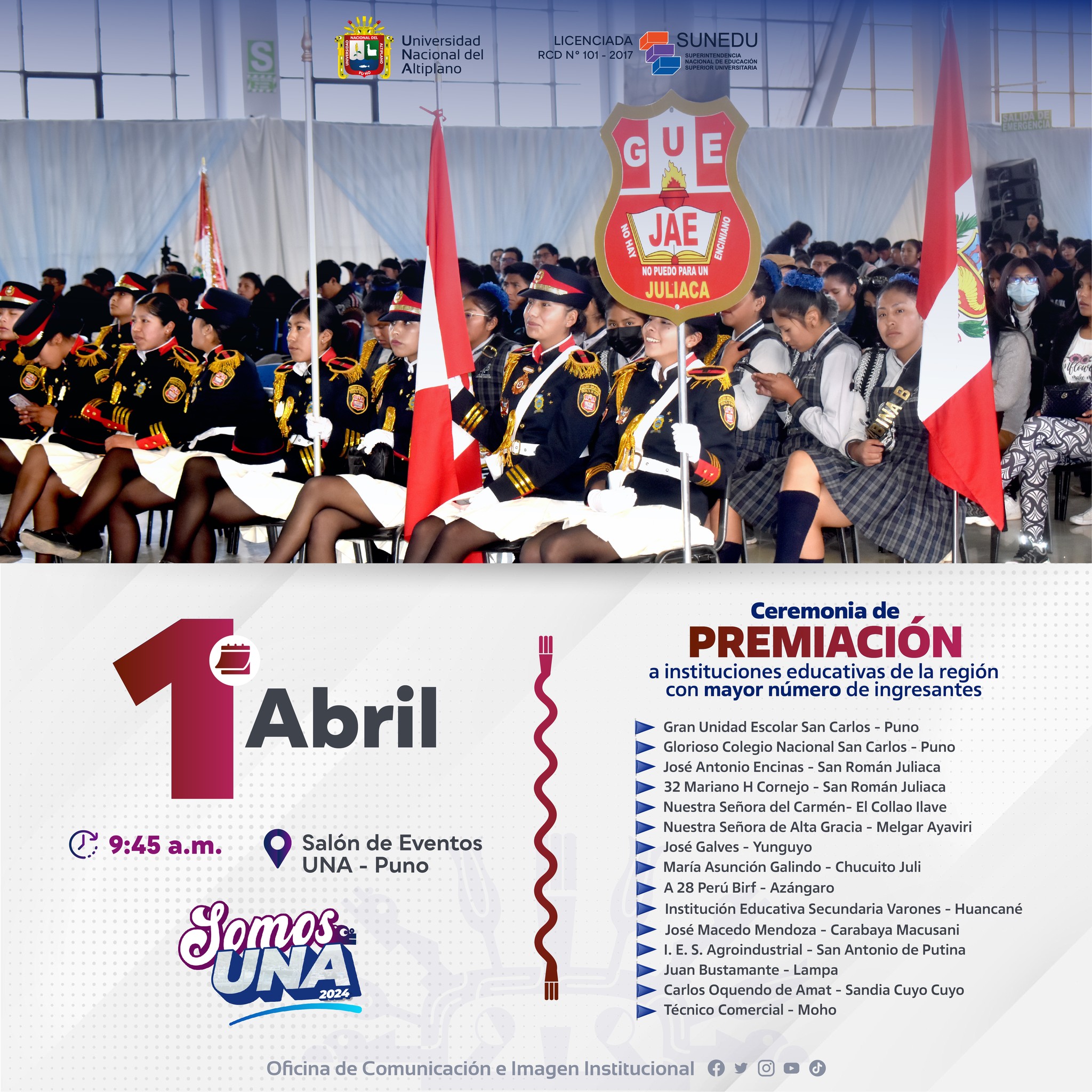 Esta actividad protocolar también tiene como objetivo reconocer y premiar a las Instituciones Educativas de la Región de Puno que han obtenido el mayor número de ingresantes, destacando así su labor en la formación de estudiantes.