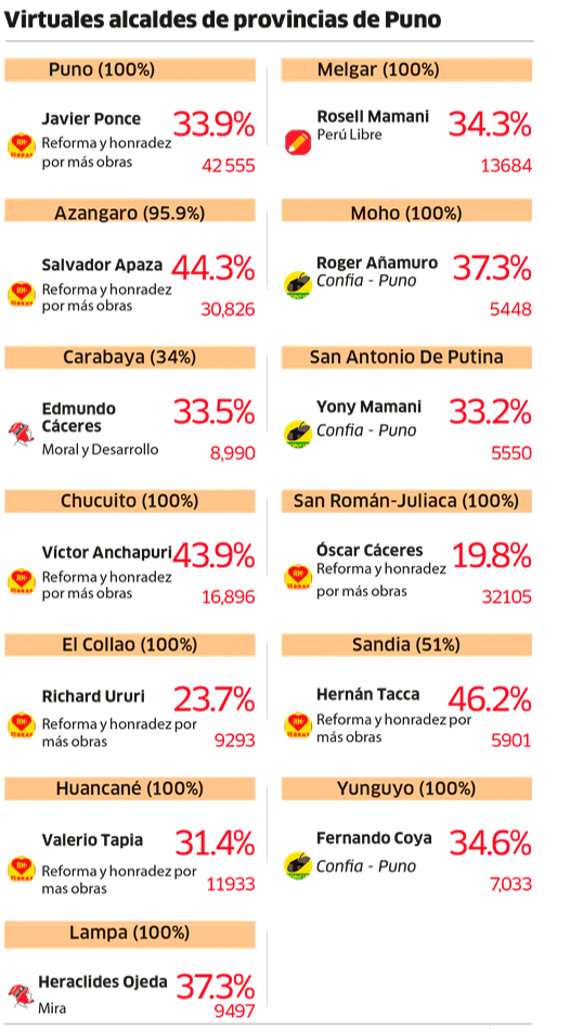 Reforma y Honradez tendría alcaldes provinciales en Azángaro, Chucuito, El Collao, Huancané, Puno, San Román, y Sandia. Mientras que CONFIA ganó en Moho, Putina y Yunguyo; en Lampa lo hizo MIRA, en Melgar ganó el candidato de Perú Libre y en Carabaya Moral y Desarrollo.