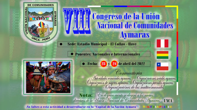 Informó que, en el segundo día, 24 de abril, elegirán a la nueva junta directiva de la organización Unión de Comunidades Aymaras (UNCA), ya que el actual presidente, Hugo Gavriel Jilaja Huiche está en cargo varios años.