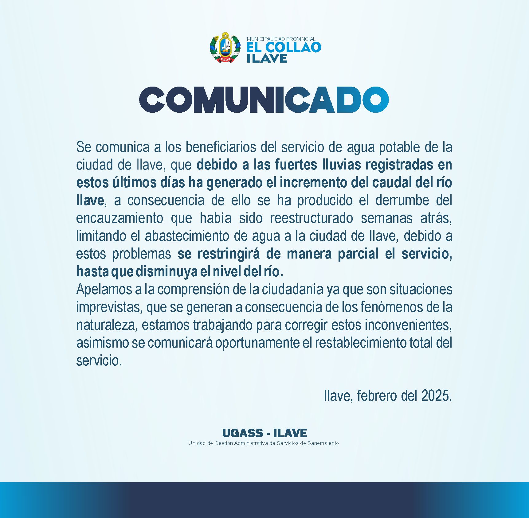 UGASS Ilave informa a los usuarios de agua potable en la ciudad de Ilave que, debido a las fuertes lluvias registradas en los últimos días, el caudal del río Ilave ha aumentado significativamente, provocando el derrumbe del encauzamiento que había sido reestructurado semanas atrás.