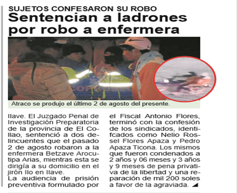 El Juzgado Penal de Investigación Preparatoria de la provincia de El Collao, sentenció a dos delincuentes que el pasado 2 de agosto robaron a la enfermera Betzave Arocutipa Arias, mientras esta se dirigía a su domicilio en el jirón Ilo en Ilave.