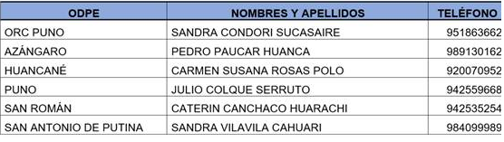 - La Oficina Regional de Coordinación (ORC) Puno y cada una de las cinco ODPE están capacitando a candidatos, candidatas y organizaciones políticas. Se puede solicitar capacitación llamando a los siguientes especialistas.