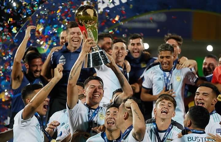 Los albicelestes festejaron el título y la clasificación a los Juegos Olímpicos de Tokio 2020 con una fecha de anticipación, pero recién, tras el último partido, pudieron levantar el trofeo que les fue entregado de la mano del Presidente de la CONMEBOL, Alejandro Domínguez.