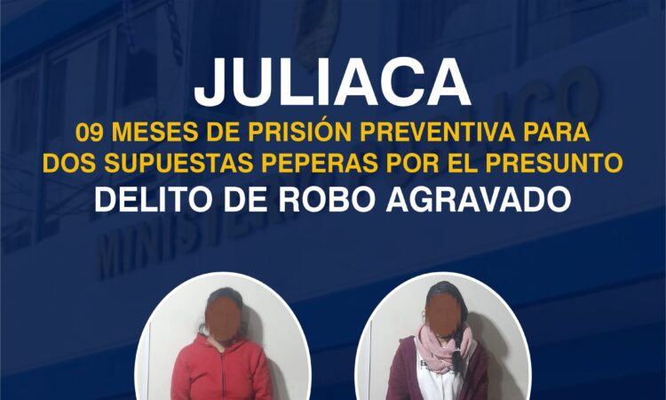 La Segunda Fiscalía Provincial Penal Corporativa de San Román – Juliaca, logró 09 meses de prisión preventiva en contra de Verónica Maricielo Cáceres Paucar y Estefany Yakelin Sucapuca Mamani, ambas investigadas por la presunta comisión del delito de robo agravado en grado de tentativa, quienes habrían pepeado a sus víctimas.