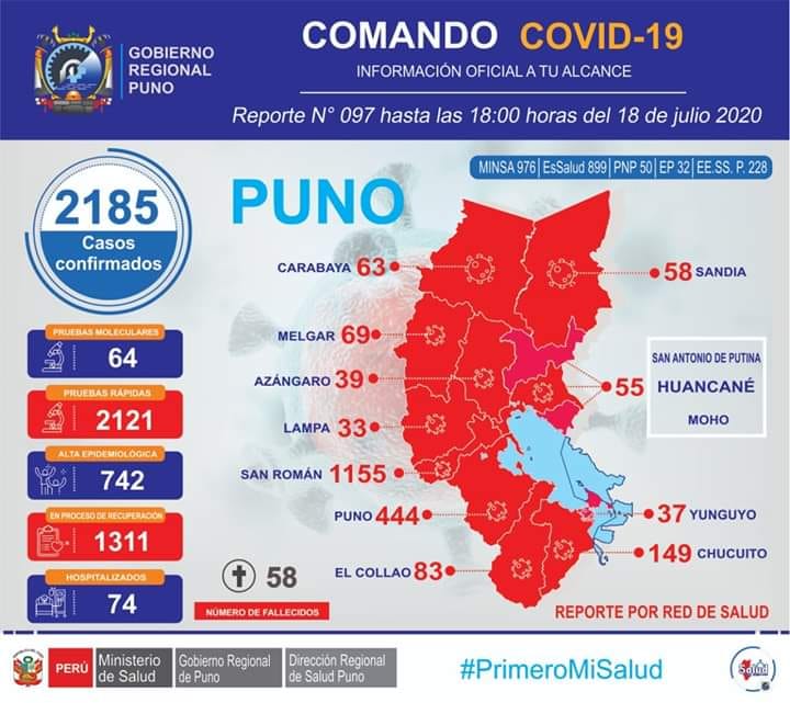 La Dirección Regional de Salud (DIRESA) de Puno y el Comando Regional COVID-19, dieron a conocer que la cifra de infectados a causa de la COVID-19 en nuestra región, ascendió a 2 mil 185 casos positivos y 58 fallecidos, según el último reporte N°097 emitido con fecha 18 de julio.