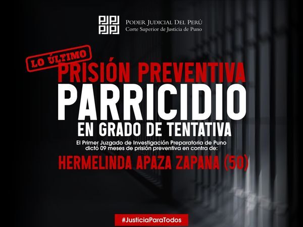 El magistrado Edson Augusto Jáuregui Mercado, juez del Primer Juzgado de Investigación Preparatoria de Puno, dictó 09 meses de prisión preventiva en contra de Hermelinda Apaza Zapana (50), quien es investigada por incurrir en el presunto delito de parricidio en grado de tentativa.