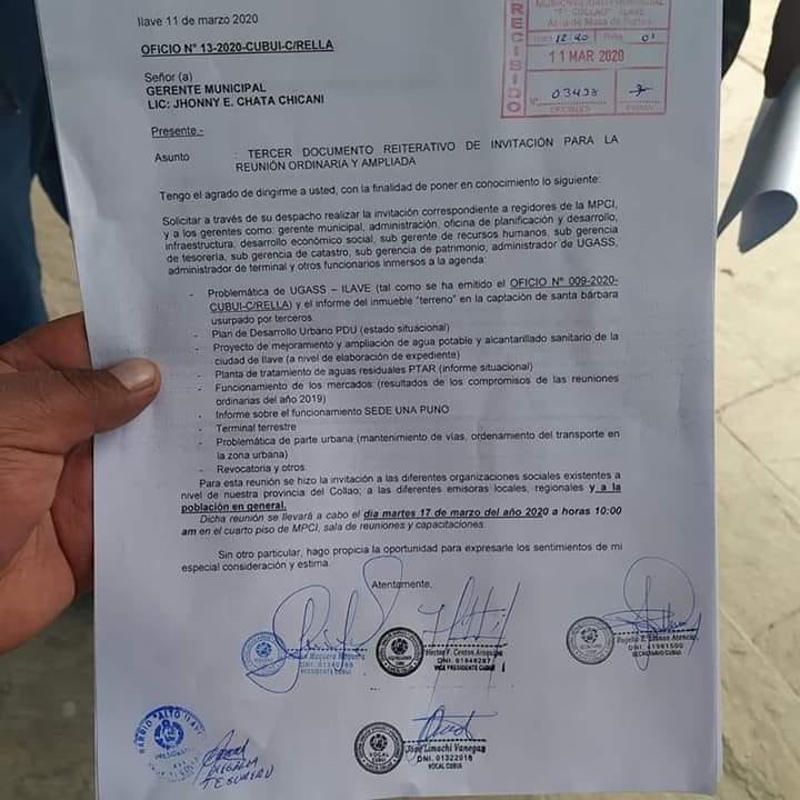 E invita a las diferentes organizaciones sociales, así mismo como a los tenientes gobernadores, presidentes, alcaldes de centros poblados y a la población en general, para ser participe a la reunión ordinaria y ampliada que se tratara varias agendas de interés provincial en calidad de suma urgencia. Para el día martes 17 de marzo del 2020 a horas 10:00 AM en cuarto piso de la MPCI.