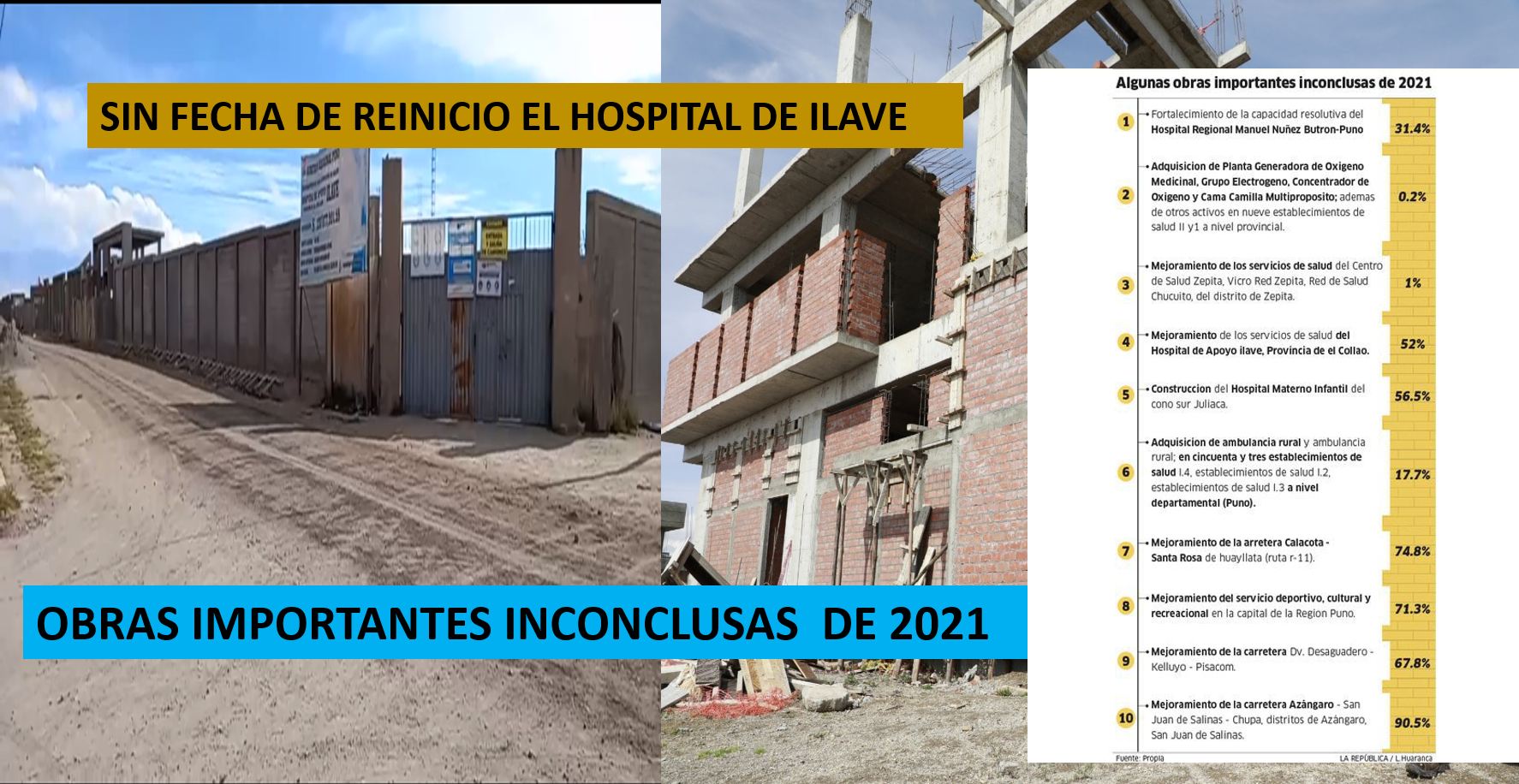 Región Puno gastó el 35% de su presupuesto para ejecutar obras, en la actualidad hay mas de 10 obras inconclusas, dentro ello esta la obra «Mejoramiento de los servicios de salud del hospital de apoyo de Ilave, provincia El Collao. Según la consulta amigable y infografía que se muestra de las diferentes obras , la obra paralizada del hospital de Ilave cuenta con un avance de 52 % , para noviembre se puso su reinicio por la modalidad de administración directa de parte del Gobierno Regional de Puno , hasta el momento no se tiene fecha de reinicio con el gobernador actual German Alejo. Quien se comprometió informar sobre las obras en cada provincia.