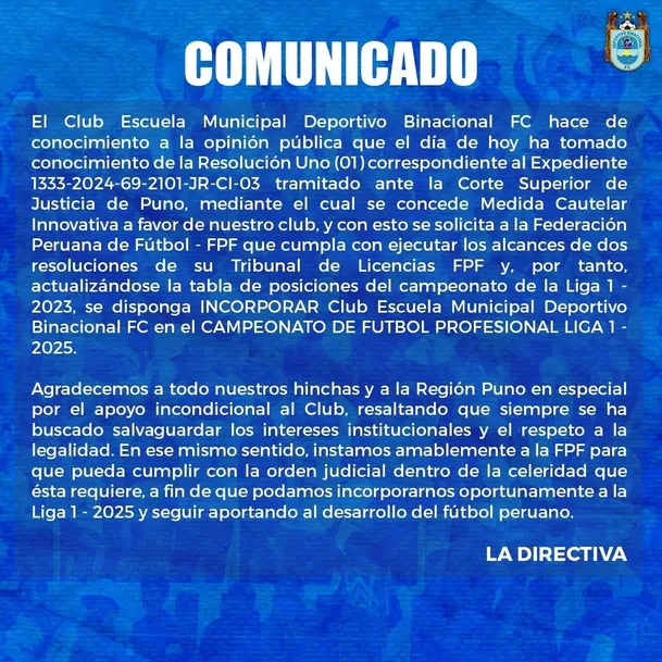 El Club Escuela Municipal Deportivo Binacional FC hace de conocimiento a la opinión pública que el día de hoy ha tomado conocimiento de la Resolución Uno (01) correspondiente al Expediente 1333-2024-69-2101-JR-CI-03 tramitado ante la Corte Superior de Justicia de Puno, mediante el cual se concede Medida Cautelar Innovativa a favor de nuestro club, y con esto se solicita a la Federación Peruana de Fútbol – FPF que cumpla con ejecutar los alcances de dos resoluciones de su Tribunal de Licencias FPF y, por tanto, actualizándose la tabla de posiciones del campeonato de la Liga 1 – 2023, se disponga INCORPORAR Club Escuela Municipal Deportivo Binacional FC en el CAMPEONATO DE FUTBOL PROFESIONAL LIGA 1 – 2025.