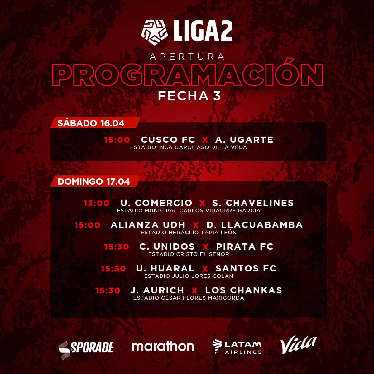 Todo empezará el sábado 16 de abril con el choque entre Cusco FC y Alfonso Ugarte a las 15:00 horas locales (20:00 GMT) en el Estadio Inca Garcilaso de la Vega. Los imperiales tienen un nuevo entrenador y saldrán por su primera victoria ante un cuadro de Puno que en dos fechas solo sumó 1 punto.